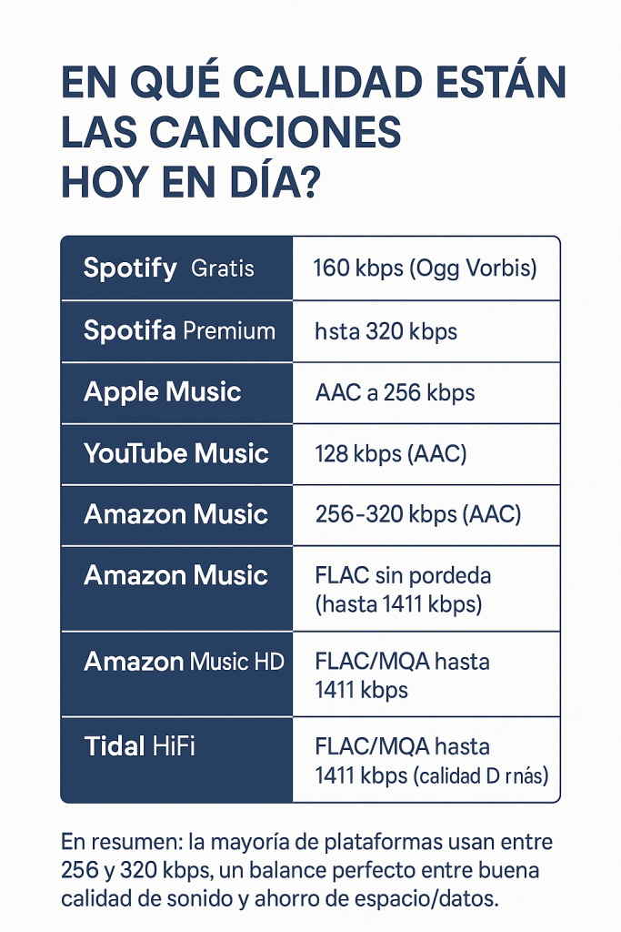 👉 En resumen: la mayoría de plataformas usan entre 256 y 320 kbps, un balance perfecto entre buena calidad de sonido y ahorro de espacio/datos.