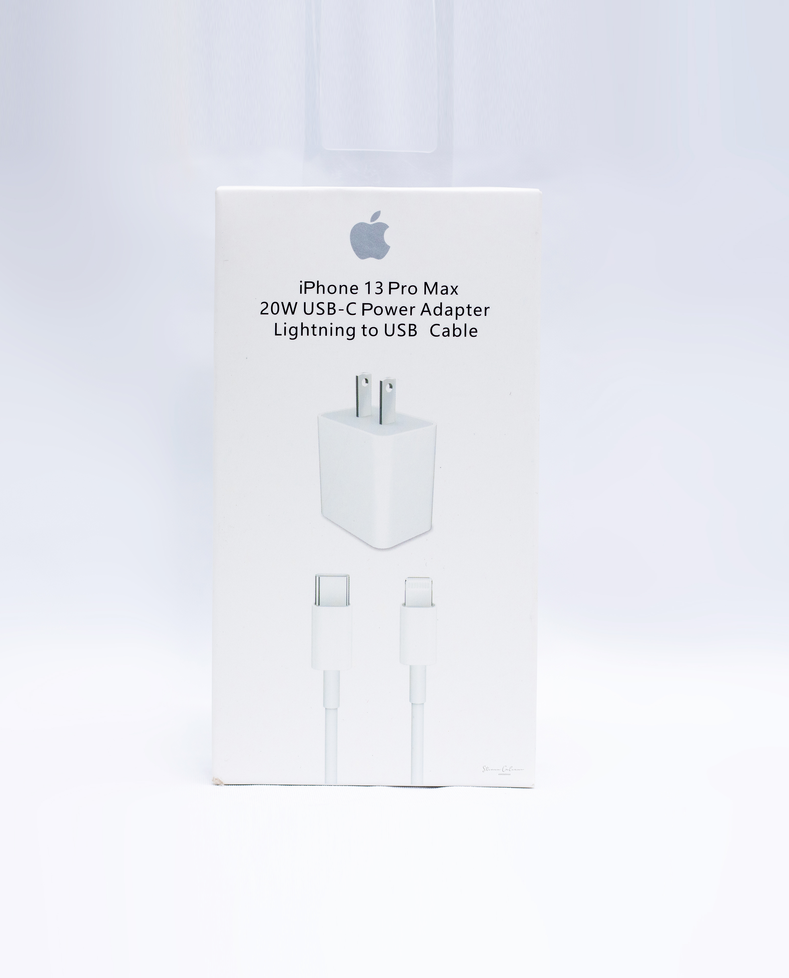 Cargador completo para iPhone de carga rápida. Potencia de 20W, incluye cable y fuente.